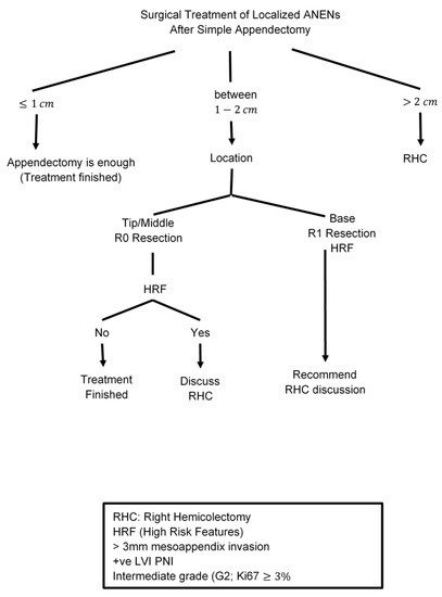 The majority of patients are diagnosed after a simple appendectomy, and further surgical intervention will depend on tumor size and the presence of high-risk features (deep mesoappendiceal invasion >3 mm, positive/unclear margins, positive lymphovascular invasion, and a higher proliferative rate). The incidence of metastasis is associated with increases in the size of ANET lesions; 2 cm lesions are found to have nodal involvement in up to 33% of cases and distant metastasis in 12% [73]. Accordingly, the consensus-based guidelines from the NANETS and the ENETS recommend a simple appendectomy for any lesion smaller than 1 cm and for those tumors between 1.0 and 1.9 cm that lack high-risk features [74,75,76]. The optimal surgical approach for localized well-differentiated ANETs between 1–2 cm with high-risk features is controversial [77,78]. The NCCN guidelines consider appendectomy alone to be adequate for all tumors <2 cm, even with high-risk features [2,27]. Other reports demonstrate a higher potential for nodal and metastatic spread with small tumors ≥1.5 cm [57,79]. Analysis of the National Cancer Institute (NCI) Surveillance, Epidemiology, and End Results (SEER) database between 1988 and 2003 identified significantly higher rates of lymph node metastases in patients with appendiceal NETs larger than 2 cm compared with those with either between 1.0–1.9 cm or less than 1 cm (86% vs. 47% and 15%, respectively) [26]. The results were confirmed in another analysis of the SEER database between 1988 and 2013 that included 573 patients with well-differentiated ANETs. The results reported a 64% probability of nodal metastases in patients with tumors >2 cm vs. 31% in those with tumors measuring 1.1–2 cm [80].