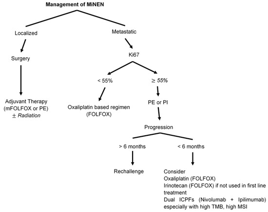 MiNEN represents an extremely rare diagnosis, but a common primary site location is the appendix. The biological behavior is usually driven by the neuroendocrine component, which is most often a poorly differentiated NEC. Therefore, MiNENs are treated similarly to pure high-grade NEC. Surgery can be considered for potentially curable early-stage disease; palliation for symptom relief is the approach for advanced-stage diseases. In one retrospective study, the median recurrence-free survival for surgery in localized disease was 12.5 months [159]. There is very limited data about the benefit of neoadjuvant and/or adjuvant therapy and minimal guidance for the choice of regimen. Two of the most used regimens in clinical practice are either EP or oxaliplatin-based (FOLFOX), but neither is supported by randomized prospective evidence. Retrospective analyses and single-institution experience have shown that multimodal treatment (including chemotherapy and/or radiotherapy) vs. surgery alone was associated with a significantly prolonged OS (75.0 vs. 18.9 months, p = 0.0045) [159]. These results demonstrated the benefit of multimodal treatment over surgery alone in localized MiNEN.