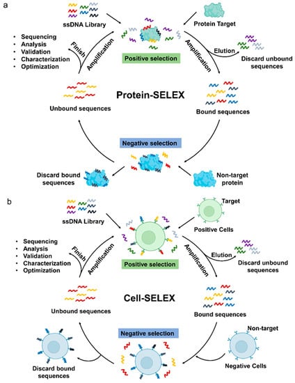 Generally, the discovery and validation of new aptamers rely mainly on SELEX, which allows the identification of aptamers by selection and amplification from a huge pool of nucleic acids composed of randomly assembled libraries [25]. Common SELEX methods fall into two broad categories, Protein-SELEX (Figure 1a) and Cell-SELEX (Figure 1b) [26]. Many specific aptamers have been developed by protein-based SELEX methods. In Protein-SELEX, purified or recombinant proteins are selected as targets for SELEX to achieve optimal enrichment during the selection process. While Cell-SELEX offers a novel option for developing aptamers [27]. Cell-SELEX starts screening with whole cells as targets, and targets on the surface of living cells exist in their natural state during the screening process, which can lead to better recognition or internalization of screened aptamers [28]. In addition, Cell-SELEX allows the discovery of new targets on the cell surface, which is essential for the discovery of small biomarkers for the treatment of diseases. So far, in the aptamer research of hematological malignancies, four aptamers were obtained by Protein-SELEX screening, while Cell-SELEX screening yielded ten aptamers, and three aptamer screens were used in both ways.