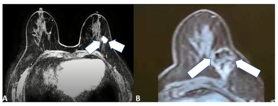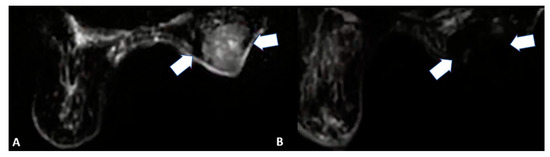 85-year-old female patient with invasive right breast cancer with axillary metastases. Diffusion-weighted imaging MRI scan showing (A) baseline large neoplastic lesion infiltrating the skin and soft tissues (arrows) and (B) 4-month follow-up after microwave ablation with absent signal restriction (arrows).