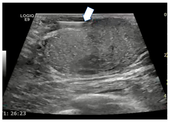 If needed, hydrodissection can be performed by injecting saline solution between the tumor and the adjacent tissue using a 20/22 G needle to prevent thermal damage to nontarget structures (Figure 7) [24]. Different tumor histology needs different needle ablation power. For deeper tumors, 30–50 W of ablative power is recommended whereas for superficial ones, 20 W is the right ablation power due to the greater injury risk to the skin and soft tissues. Ablative approaches should be performed with a pullback technique to cover the tumor area [24].