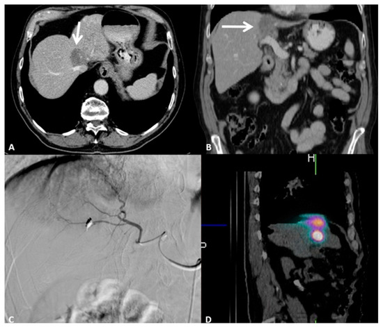 79-year-old male patient presenting with pain in the right upper abdominal quadrant due to intrahepatic cholangiocellular carcinoma. Performance Status One, no surgical indication; the patient underwent eight cycles of chemotherapy. (A) Contrast-enhanced axial CT scan showing a 3.5 cm lesion of the I-IV segment adjacent to the inferior vena cava and to the right hepatic vein. (B) Contrast-enhanced coronal CT scan showing how the lesion is adjacent to the portal vein. (C) Digital subtraction angiography runs showing super selective catheterization of the target vessel with intra-arterial administration of marked albumin macroaggregates, which serve as the diagnostic phase of radioembolization. (D) Single-photon emission computed tomography oblique reconstruction scan showing focal and selective uptake of marked albumin macroaggregates by the target lesion, confirming the catheter position for the therapeutic radioembolization.