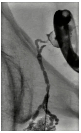 The main role of INL is the detection of lymphatic leaks (75% of lymphangiographies with a median fluoroscopy time of 60 min); however, it was soon clear that this technique could be often therapeutic, especially for the treatment of chylous effusions, due to the viscosity of Lipiodol [77,78]. A low effusion volume (<200 mL/day) predicts 97% success, and <500 mL/day predicts 70% success; generally, <1000 mL/day of volume effusion is a good predictor of clinical success. In the last five years, the importance of this procedure in relation to complications after pelvic or retroperitoneal surgery, such as lymphoceles (Figure 9), has been growing [79,80].