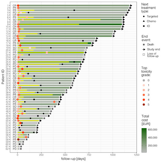 Swimmer plot: follow-up of each patient from the start of ipilimumab–nivolumab until death, study end, or loss of follow-up; treatment duration (yellow bars); best overall response following RECIST 1.1 (CR: complete response, PR: partial response, SD: stable disease, PD: progressive disease); maximum toxicity grade experienced (red dots); next treatment line (black symbols); and total cost (shades of green). Figure produced in R v4.0.3 [19] using ggplot2.