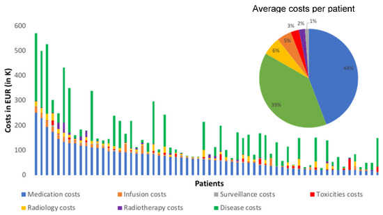 Total cost per patient with contributions of the cost categories defined in Table 1. Inset: average proportion of each cost category over the whole cohort (same color code as main graph).