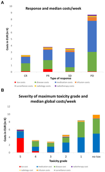 Since follow-up times varied between 18 to 1173 days, we also calculated the median costs per week of follow-up and compared to the response and severity of toxicity. Figure 5A shows that CR patients had the lowest global cost per week (EUR 2425/week) despite the associated toxicities. Conversely, PD patients had the highest cost per week (EUR 8325). PR and SD patients had similar intermediate costs (~EUR 3500/week). Thus, the general trend is that good response implies lower weekly costs. Overall, the median toxicity cost per week is again insignificant compared to the two most expensive categories. Disease costs in patients with CR were lower (EUR 1212/week) compared to PD patients (EUR 2979/week) with a similar trend for medication costs (EUR 969/week for CR patients compared to EUR 4724/week for PD patients).