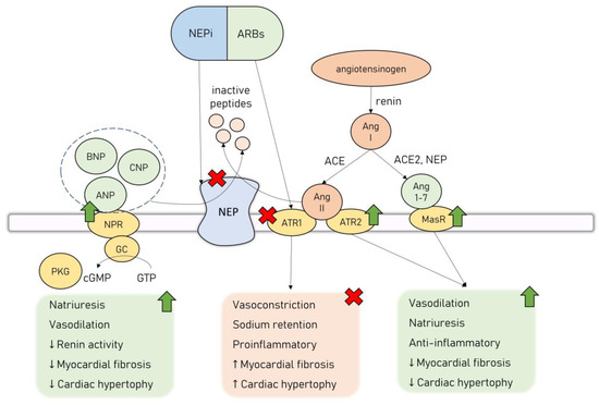 - D’Elia, E.; Iacovoni, A.; Vaduganathan, M.; Lorini, F.L.; Perlini, S.; Senni, M. Neprilysin inhibition in heart failure: Mechanisms and substrates beyond modulating natriuretic peptides. Eur. J. Heart Fail. 2017, 19, 710–717. [Google Scholar] [CrossRef]