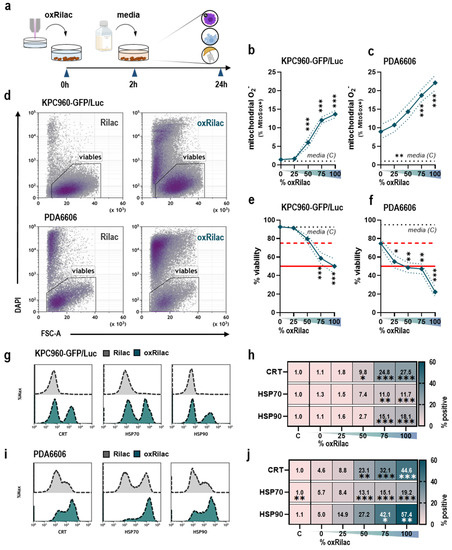 The most promising anti-cancer therapeutic strategies engage the immune system. As tumor cells acquire distinct mechanisms to evade the immune system, one approach is to enhance the immunogenicity of cancer cells. To explore whether oxRilac triggers these responses, the appearance of pro-immunogenic surface markers on dying cancer cells was evaluated. After exposure to oxRilac solutions, the surface translocation of key molecules involved in immunogenic cell death (ICD), such as calreticulin (CRT) and heat-shock proteins (HSP) 70 and 90 (Figure 1g,i), was significantly increased in KPC960-GFP/Luc (Figure 1g) and PDA6606 cells (Figure 1i).