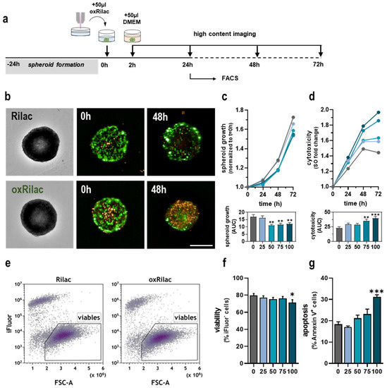 Three-dimensional, extracellular matrix-producing tumor spheres allow for the advanced screening of treatment strategies in vitro. Therefore, we validated the tumor toxicity of oxRilac solutions, observed in the monolayer cell cultures presented above, in pancreatic cancer spheroids (Figure 2a). The monitoring of spheroids, using high-content imaging for 72 h after exposure to oxRilac solutions (Figure 2b), revealed a significantly lower growth rate that was not dose-dependent (Figure 2c). Growth kinetics can be altered due to a temporary cell cycle delay or exposure to a cytotoxic agent. To determine which of the two mechanisms contributed to the lower growth rate of spheroids, KPC960-GFP/Luc cells were stained with Sytox orange to label terminally dead cells after treatment. Exposure to serial dilutions of oxRilac solutions confirmed a dose-dependent, tumor-toxic effect on KPC960-GFP/Luc cells (Figure 2d). A flow cytometric analysis of digested tumor spheroids was performed after 24 h to elucidate the mode of cell death and distinguish necrotic from apoptotic tumor cells (Figure 2e). Strikingly, only a slight decrease in cellular viability was observed after 24 h, which was in line with high-content imaging time-lapse experiments (Figure 2f). A hallmark of cells undergoing apoptotic cell death is the translocation of the phospholipid phosphatidylserine to the outer cell membrane, which is detected using Annexin V staining. Our results showed increased levels of phosphatidylserine in KPC960-GFP/Luc cells in spheroids after exposure to a 100% oxRilac solution, indicating the induction of pro-apoptotic signaling pathways (Figure 2g).