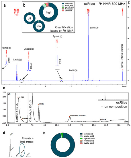 Gas plasma treatment of Ringer’s lactate solutions yields lactate oxidation. (a) 1H-NMR spectrum of oxRilac in the range from δ = 0 to δ = 4.8 reveals lactate signals (doublet δ = 1.33, quadruplet δ = 4.12), acetic acid as major product (singulet δ = 1.91), smaller signals belonging to pyruvic acid (singulet δ = 2.38) and glycolic acid (singulet δ = 3.95), and formic acid (singulet δ = 8.46), apart from contaminants (disinfectants) on the control level; (b) quantification of educts and products in control (Ringer’s lactate solution with 25 mM of lactate) and extended (10 min) gas plasma-treated samples (22.1 ± 0.5 mM of lactate, 1.5 ± 0.1 mM of known products, 1.4 ± 0.1 mM of unknown products) as well as short treatment (1 min) conditions (1.5% products, mainly acetic acid); (c) oxRilac ion chromatogram showing lactate (RT = 4.13 min) and chloride ions (RT = 6.55 min); acetate (lactate peak shoulder), formate, and oxalate; (d) pyruvate is detectable through ion chromatography immediately after gas plasma treatment in Ringer’s solution without chloride ions; (e) ion chromatography quantification reveals abundant pyruvate (≈430 µM) and acetate (≈250 µM) and only minor traces of oxalate (25 µM) and formate (6 µM).