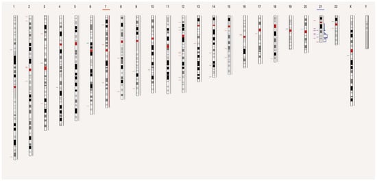 Whole-genome sequencing (WGS) was used to confirm the existence of extra SVs. These were identified by OGM, have with potentially clinical significance and were found via the MGI Tech (DNBSEQ-T7) platform []. A MGIEasy FS DNA prep kit (BGI, Beijing, China) was used for WGS library construction according to the manufacturer’s instructions. Paired-end sequencing was performed on a DNBSEQ-T7 sequencing instrument, yielding ~150 bp-sized sequencing reads. A raw data quality check was conducted using FastQC (version 0.11.9). Base quality information was obtained from the FastQC results. Then, the filtered files were mapped to the reference human genome (hg38), and the output BAM files were sorted using samtools sort. The following criteria were used to determine whether SVs, detected independently by OGM and WGS, refer to the same event: (1) deletions, insertions, and duplications, detected by WGS, must overlap with the SV interval defined by optical mapping by at least 50%, and the difference in size predicted by the two methods must be less than 30%; (2) For translocation and inversion, the breakpoint detected by WGS must be within 500 Kb of the breakpoint detected by optical mapping, and the SV direction determined by the two methods must be consistent.