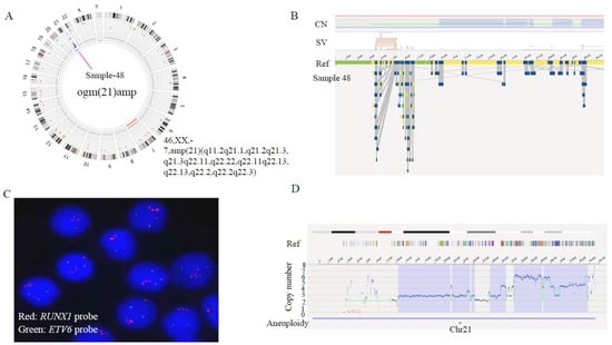 In line with the advantage of higher sensitivity and resolution of OGM, our data showed that OGM was able to refine the karyotype (Table 2 and Table 3). In sample 48, besides iAMP21 revealed by FISH, OGM further detected a chromothripsis of chromosome 21 (Figure 2). Intra-chromosomal amplification of chromosome 21 (iAMP21) defines a subgroup of pediatric B-ALL, characterized by multiple structural abnormalities of amplification, inversion and deletion, and which has a poor prognosis with standard therapy []. The circus plot illustrated the shattering of chromosome 21, resulting in large-scale intra-chromosomal rearrangements. Furthermore, the overall copy number of chr21 was more than 3, and the copy number in the region from 33.2Mb to 39.2Mb, where RUNX1 lies, was 6. Array-based comparative genomic hybridization (aCGH) revealed that the gene amplification/deletion patterns of abnormal chromosome 21 were significantly different among patients []. Consistent with previous studies [,], at the OGM-CNV interface, we also see a classical stepwise rise in copy number around the 33–45 Mb region, followed by a sharp drop off to deletion or normal diploid levels. These patterns were consistent with the classical breakage—fusion—bridge (BFB) cycle of oncogene amplification []. At the same time, we also observed some secondary genetic changes in this sample, including −7 (5%) [], P2RY8::CRLF2 (17%) and IKZF1 (22%) deletion [], etc. By comparing copy number profiles from the OGM with those from previous microarray studies, the altered complexity observed by the OGM brings an intuitive visual illustration of the BFB mechanism.