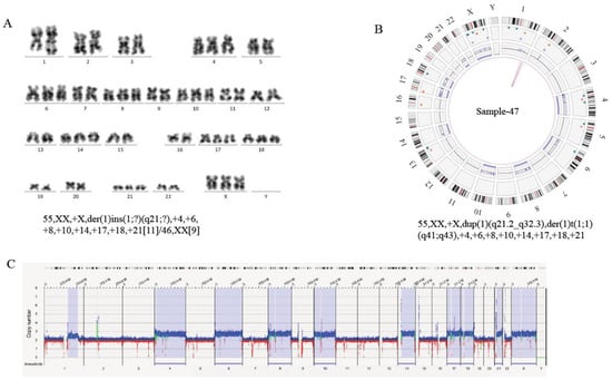 Production of an Accurate Cytogenomic Karyotype by Refining Cytogenetic Breakpoints and Resolving Unknown Cytogenetic Elements by OGM. (A) Standard G-banded karyotyping in sample 47 show the karyotype as 55, XX, +X, der(1)ins(1;?)(q21;?),+4,+6,+8,+10,+14,+17,+18,+21[11]/46,XX[9]. (B) Circus plot, showing a whole-genome view of a derivative chromosome 1 (pink lines) and copy number profiles (inner circle blue boxes indicate gains and red boxes indicate deletions). Thus, OGM identified additional intra-chromosomal translocation in chromosome 1 and refined the karyotype as 55, XX, +X, dup(1)(q21.2q24.3-q24.3q32.3), der(1) t(1;1)(q41;q43), +4,+6,+8,+10,+14,+17,+18,+21. (C) Whole-genome CNV profiles, generated with Bionano Access, indicates gains of chromosome 4, 6, 8, 10, 14, 17, 18, 21, 23. Some regions of chromosome 1 were amplified, and the y axis shows copy numbers ranging from 0–8 for each chromosome. The x axis shows increased copy numbers in blue and decreased copy numbers in red. The light blue region, highlighted for the above chromosomes, indicates a significant difference from the baseline, thus flagging a gain in those chromosomes. All chromosomes, except the sex chromosomes (Y)×0 and chromosomes (4, 6, 8, 10, 14, 17, 18, 21, 23)×3, are present in 2 copies.