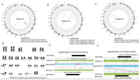 Identification of additional SV findings by OGM. (A) Circus plot showed a translocation between chromosomes 12 and 21 and the internal rupture of chr5, resulting in the formation of a derivative chromosome in case 46. (B) Circus plot showed three-way translocations between chr12 and 21, chr12 and 16, and chr16 and 21, respectively, in case 103. (C) Circus plot showed two translocations between chr11 and 22, chr13 and 19 in case 66, respectively. (D) Standard G-banded karyotyping showed t (11;22) (q24.3; q12.2) (blue arrow) and t(13;19) (q14.13;q13.3) (red arrow). (E,F) Linear genome browser representation of known FLI1::EWSR1 fusion and a novel TMEM272::KDM4B fusion in case 66. Green represents GRCh38 reference chromosomes with OGM label patterns. Light blue represents assembled sample maps with label patters. Grey lines represent label alignments between two maps. Purple represents translocation breakpoints. Black lines represent the genes in this region.