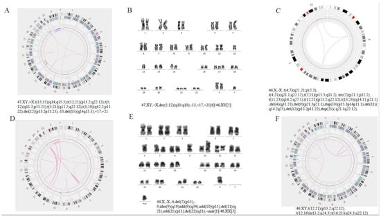(A,B) Sample 114: A G-banded karyotype was performed and initially reported as the derivative chromosomes 5 and 12, add (17), add (21), add(X), del (13) in 6 metaphases with five metaphases with a normal karyotype. Optical genome mapping data confirm all known aberrations and show the presence of additional translocations t(15;15)(q14;q15.3), t(5;12)(q11.2;p11.23), t(5;21)(q11.2;q22.12), t(1;10)(q42.2;p11. 22). (C–E) Sample 83: Optical genome mapping data showing a three-way translocation 46,XX,t(4;7;21)(q21.21;p15.3;q11.2); multiple deletions (4,9,11,12,X) and duplications (10,21) on chromosome segments were also shown, as well as translocation between multiple chromosomes. Karyotype did not indicate multiple translocations between chromosomes. (F) Sample 103: Optical genome mapping confirm a three-way translocation on chromosomes 12, 16 and 21, while the G-banded karyotype (not represented in this plot) was normal.