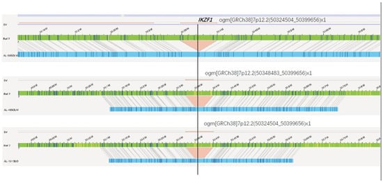 In the aspect of single-gene aberrations, d15 MRD was positively correlated with aberrations in NF1 and ERG. The gene d33MRD was positively correlated with abnormalities in NF1, SH2B3, IKZF1, ERG and CREBBP; d78 MRD was also positively correlated with abnormalities in KMT2A, CREBBP, BTG1 and PIK3CA. Moreover, abnormalities in CREBBP, ERG, KMT2A and SH2B3 were all correlated with risk stratification. Aberrations in BCR, ABL1 and TCF3 were all positively correlated with the number of leukocytes found at diagnosis (Table 7). In addition, IKZF1 aberrations were positively correlated with age, and the IKZF1 deletion site were, the same as 7p12.2(50324504_50399656), detected by OGM in patient maps (sample 48, 58, 101) (Figure 7). Patients are classified as IKZF1plus positive if they harbor an IKZF1 deletion plus a deletion involving CDKN2A/B, PAX5, or PAR1 (positive for P2RY8::CRLF2), without a concurrent ERG deletion []. We detected IKZF1 deletion in 3 cases, among whom patient #48 met the criteria of IKZF1plus, and also harbored iAMP21. The patient was treated with high-risk regimen, with d15MRD of 3.20 × 10−2 and negative MRD at the end of induction. The other two non-IKZF1plus patients (Case #101 and #58) had increased copy number of AML1 and BCR::ABL1 fusion, respectively. Case #101 received high-risk treatment with negative MRD at both day 15 and 33. Case#58 was classified into the intermediate-risk group, and died of acute intracranial hemorrhage during induction. Due to the limited number of samples, we could not obtain clinical characteristics of the IKZF1plus cases. Importantly, this study suggests the potential of OGM to detect the genetic aberrations of IKZF1plus in an all-in-one process. Its clinical value would be further verified in future studies with a large sample size.