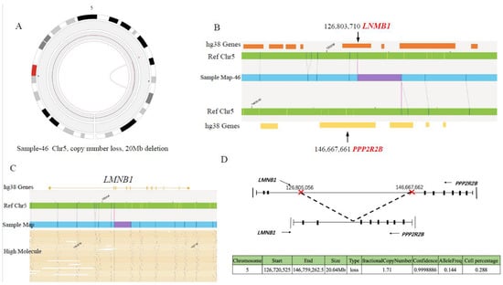LMNB1-PPP2R2B fusion gene identified by OGM. (A) Zoom-in circus plot of chromosome 5 only, showing the fusion called by the SV and CNV tool. (B) Chromosome map view, navigated from circus plot, supports the existence of the fusion. The lower track shows the fusion call from the map, specifying the deletion between chr5:126,803,710 and chr5:146,667,661 (size: 20 Mbp). (C) OGM provides direct evidence for LMNB1::PPP2R2B fusion: aberrant molecules supporting the translocation. (D) Diagram of LMNB1::PPP2R2B fusion pattern.