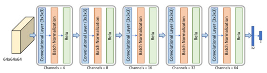 The architecture of VB-NET is shown in Figure 2. We used a 3D CNN, consisting of five reduction blocks. The input volume (4D data) represented the smallest cubic box surrounding the tumor region or lesion of each patient. Because the SVB considered a selection rectangle size that varies according to each patient’s tumor region, resizing was used to give the volumes a common size of 64 × 64 × 64, before feeding them to the VB-NET.