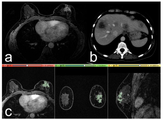Case of a 52-year-old woman with a G3 triple negative invasive ductal carcinoma, Ki-67 of 30%. (a) The post-contrast image shows a retroareolar irregular non-mass-enhancing lesion in the left breast. (b) At 1-year follow-up: post-contrast axial CT image, with some metastatic nodules in the liver parenchyma. (c) Representation of the extraction of the segmentation mask.