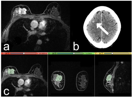 Case of a 53-year-old woman with a G2 Luminal B invasive ductal carcinoma, Ki-67 of 25%. (a) The post-contrast image shows an irregular mass-enhancing lesion in the upper quadrants of the right breast. (b) At 3-year follow-up: post-contrast axial CT image, with a metastatic nodule in the right frontal lobe (arrow). (c) Representation of the extraction of the segmentation mask.