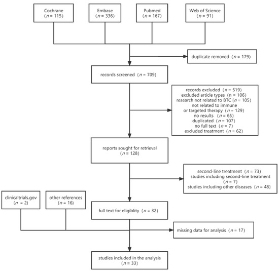 We initially identified a total of 888 articles from four databases. After excluding 179 duplicates, 709 articles remained. Then, we screened titles and abstracts to exclude the types of articles that did not meet the criteria, leaving 128 articles. Full-text screening was performed to exclude 73 articles with immunotherapies or targeted therapies as second-line therapy, Seven articles with a mix of first-line and second-line therapy, and eight articles whose studies included other diseases were excluded, leaving 33 included. After searching clinicaltrial.gov and checking the reference of the included literature, 17 additional studies were identified, resulting in a final 33 studies that met all the inclusion criteria (Figure 1). The total number of patients included in the trials is 3087.