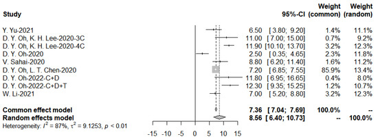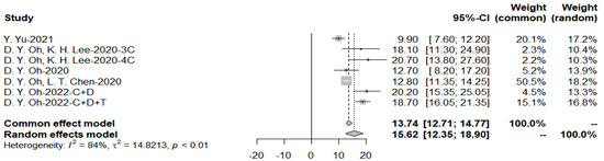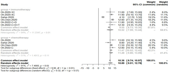 As shown in Table 4, the included immunotherapy-related studies were published between 2018 and 2021. The trial of Oh et al., 2020 [41] of Bintrafusp alfa is a phase 2/3 trial. Oh et al., 2022 [42] is a phase 3 trial, demonstrating the effectiveness of Durvalumab in combination with chemotherapy therapies. No immunotherapy was used alone in any of the study’s regimens, which all combined both immunotherapy and chemotherapy as the first-line treatment. A total of 1286 patients were included.