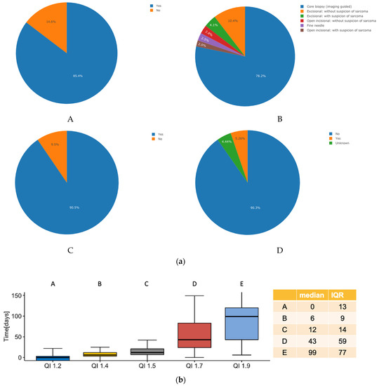 (a) Pie chart analysis for four of the nine quality indicators of the sarcoma work-up; (A), was imaging performed before biopsy? (B), which type of biopsy was performed? (C), was biopsy conducted before initiation of treatment? (D), was metastasis present at diagnosis? (b) Box plot analysis for five of the nine quality indicators of the sarcoma work-up; A, time from first patient contact to biopsy, B, time from biopsy until establishment of diagnosis, C, time from biopsy until sarcoma board presentation, D, time from diagnosis to initiation of therapy and E, time from sarcoma board presentation to initiation of treatment.