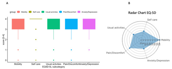 (A) Box plot summary of EQ-5D including 511 consecutive patients. (B) Radar chart summary of one single patient representing the five dimensions of EQ-5D.
