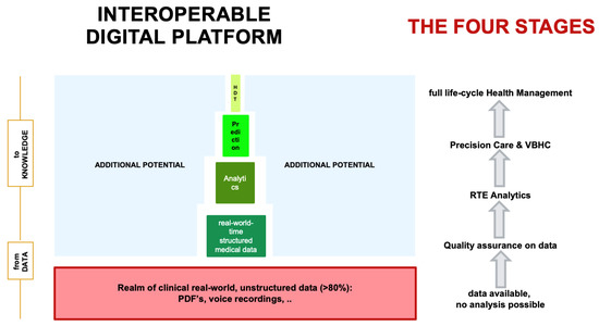 Cost increases in health care is a universal problem. Porter et al. introduced the concept of value-based health care (VBHC) [16,17,27]. Herein, shared value is defined by the quality of patient care and outcome divided by the total cost over the entire cycle of care [28,29]. The prerequisite to introduce VBHC to create a new ecosystem is the definition of quality. Because the digital interoperable platform encompasses the entire cycle of care and because each structured QI parameter can be attributed a cost tag, it will become possible for the first time to determine the entire costs of the treatment for a given disease and patient (Figure 3). Above all, cost containment will be based uniquely on quality measures with such a setup, which enables the introduction of VBHC through disruption of the current ecosystem. Importantly, this has great potential to achieve cost containment for the benefit of the patient as well as a sustainable health care system [30].