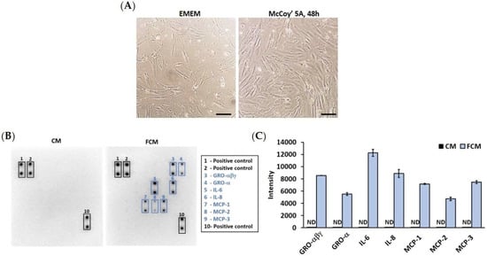 A Human Cytokine Antibody Array (Abcam, Cambridge, UK, Ab133996) was performed with CM (as a control) and FCM following the protocol instructions. The positive cytokines were detected, and the intensities were analyzed with the ChemiDoc imaging system (Bio-Rad Finland, Helsinki, Finland).