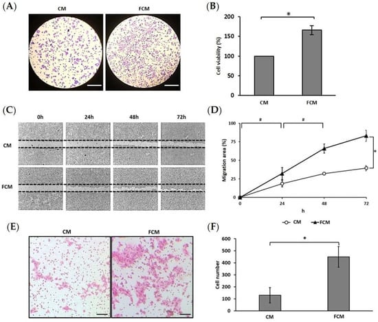 This study aimed to investigate the neighboring fibroblasts’ effects on the progression of colorectal cancer cells. The progression of colorectal cancer cells involved high growth, migration, and invasion capacities in HCT116 cells, a highly aggressive cancer. The MTT assay illustrated cell viability, which showed that FCM induced significant growth (165.96 ± 11.15%) compared to normal conditions (CM) (Figure 2A,B). The wound-healing assay was performed for HCT116 cells that migrated. This result showed that the FCM-treated cells significantly activated HCT116 migration each day (32.22 ± 8.18, 65.92 ± 6.14, and 83.07 ± 7.34 percent of the wound area at 24, 48, and 72 h, respectively). The endpoint (72 h) showed that the FCM-treated cells also significantly increased HCT116 migration compared to the control (Figure 2C,D). The invasive capacity observation found that the FCM-treated cells had a significantly higher number of invasive cells (449 ± 86 cells/field) than the control (130 ± 63 cells/field) (Figure 2E,F). These results suggested that FCM can induce the aggressive progression of HCT116 colorectal cancer cells.