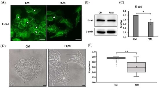 The epithelial–mesenchymal transition (EMT) process is a crucial step of the cancer cell in cancer progression, migration, invasion, and metastasis. This study aimed to investigate epithelial markers and the morphological alteration of HCT116 cells after being induced with FCM. Immunofluorescence found that FCM-treated cells showed a loss in the localization of E-cadherin at the junction between cells. In addition, the protein expression according to Western blot analysis also showed a significant reduction in E-cadherin in FCM-treated cells (0.69 ± 0.12) compared with the control (1.00 ± 0.00) (Figure 3A–C). The morphological alterations were also interpreted using shape factors whereby equal to one is a circular or polygonal shape cell, and less than one is an elongated cell, which refers to a mesenchymal appearance. The calculation of the shape factor showed 0.94 ± 0.07 and 0.61 ± 0.23 for control and FCM-treated cells, respectively. FCM-induced HCT116 had an intensely potent ability to alter the morphology from a polygonal shape to an elongated shape (Figure 3D,E). Therefore, the FCM-treated cells showed decreased expression of the epithelial marker, E-cadherin, and there was an increased appearance of mesenchymal cells with elongated cells, indicating the EMT process.