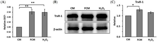 Oxidative stress is a major factor inducing cancer progression. This study aimed to investigate the roles of highly proliferative fibroblasts in total oxidative stress, and the expression of the oxidative stress-sensitive molecule, TrxR-1, in HCT116 colorectal cancer cells. The cellular oxidative stress of HCT116 cells was detected with a DCFH-DA assay. The results showed that FCM-treated cells had a higher cellular oxidative stress (2.54 ± 0.24) than a normal condition (CM, 1.00 ± 0.00) (Figure 4A). In addition, Western blot analysis was performed to investigate the protein level of TrxR-1. The results showed that the relatives of TrxR-1 are 1.00 ± 0.00 and 1.37 ± 0.15 for control and FCM-treated cells, respectively (Figure 4B,C). These results show that FCM induced TrxR-1 in the high-oxidative-stress condition in HCT116 colorectal cancer cells.