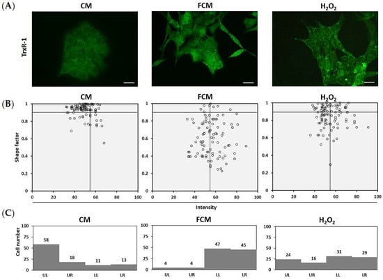 This study focused on the correlations between TrxR-1 expression and cancer cell morphology. The experiment was performed with an immunofluorescent technique to detect the intensity of TrxR-1 expression. The correlation was determined and represented with a dot plot of TrxR-1′s intensity and shape factor. The dot plot illustrated that most control cells showed a round shape and low intensity of TrxR-1; in contrast, the FCM-treated cells showed a high intensity of TrxR-1 in the mesenchymal shape (Figure 5). This result shows that the high expression of TrxR-1 was associated with FCM-induced mesenchymal alteration.