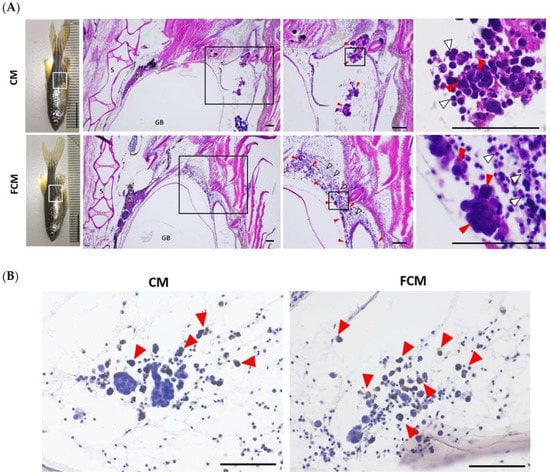 Besides the direct effect of fibroblasts on cancer cell alteration, cooperation with leukocytes might support cancer dissemination. Our histological examination illustrated that FCM-treated cells had many scattered microtumors with massive leukocyte infiltration. In contrast, the control group showed an embedded tumor and lower cellular response. Previous studies have suggested that cancer metastasis involves cytokines, chemokines, and growth factor secretions [,]. Interestingly, the FCM group featured the aggressive progressions of cancer cells with fibroblast-secretory cytokines, including