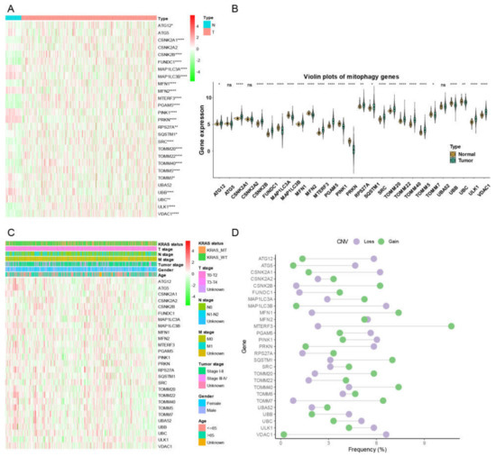 The landscape of gene expression and CNV of mitophagy genes in LUAD. (A) the heatmap of the gene expression level of mitophagy genes between normal (N) and tumor (T) tissues of LUAD in TCGA. (B) the violin plots which presented the expression of each mitophagy gene between normal and cancer tissues of LUAD in TCGA. (C) the expression of mitophagy genes in LUAD with clinicopathological features that comprises age, gender, T stage, M stage, N stage, tumor stage, and KRAS status. (D) the CNV distribution of mitophagy genes in TCGA database. The asterisks represented the statistical p value (* p < 0.05; ** p < 0.01; **** p < 0.0001, “ns” represents p value over 0.05).