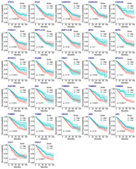 The association between the gene expression of mitophagy genes and the OS of LUAD by KM plots.