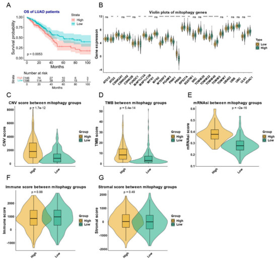 The mitophagy clusters and their relationship with TMB, total CNVs, stem cell phenotype and immune and stromal scores in LUAD. (A) the KM plot of the different mitophagy clusters. (B) The expression pattern of mitophagy genes between the two mitophagy groups. The asterisks represented the statistical p value (ns p > 0.05; * p < 0.05; ** p < 0.01; *** p < 0.001; **** p < 0.0001). (C–G) the violin plots presented the association between mitophagy groups and TMB (C), total CNVs (D), stem cell phenotype (E) and immune (F) and stromal scores (G) in TCGA-LUAD cohort. The “e” in the p value of Figure (C–E) represents E-notation. The E-notation is written as mEn, which is equal to the scientific notation that is written as m × 10n.