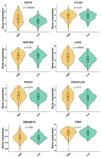 Violin plots were used to describe the expression levels of 8 immune-checkpoint genes in the two mitophagy groups. The immune-checkpoint genes comprised CD274, cytotoxic T-lymphocyte associated protein 4 (CTLA4), hepatitis A virus cellular receptor 2 (HAVCR2), lymphocyte activating 3 (LAG3), programmed cell death 1 (PDCD1), programmed cell death 1 ligand 2 (PDCD1LG2), sialic acid binding Ig like lectin 15 (SIGLEC15), and T cell immunoreceptor with Ig and ITIM domains (TIGIT). The difference of immune-checkpoint gene expression between mitophagy groups was assessed by Wilcoxon analysis.
