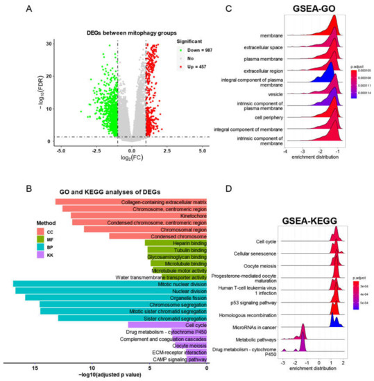 The DEG identification and related functional analyses. (A) The volcano plot of DEGs between mitophagy groups. (B) The GO and KEGG analyses of DEGs between mitophagy groups. (C,D) The GSEA of DEGs by GO (C) and KEGG (D) category.