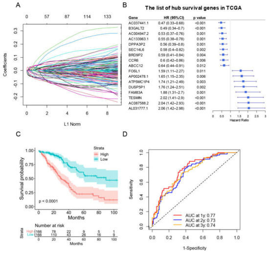 We next explored the potential mitophagy-related prognostic signature. We started by performing univariate Cox analysis in each mitophagy related DEG. We discovered 235 genes linked to an inferior OS of LUAD and 309 genes linked to a favorable OS of LUAD (Table S4). The selected survival related genes were then put into a LASSO-based Cox analysis. There were 17 genes (CCR6, TESMIN, ABCC12, FAM83A, B3GALT2, FOSL1, DUSP5P1, DPPA3P2, SEC14L6, AL031777.1, ATP5MC1P4, AC133963.1, AC037441.1, BRD9P2, AP002478.1, AC087588.2 and AC004947.2) finally selected as hub survival genes, as they had nonzero coefficient values by the LASSO analysis (Figure 9A and Table S5). The detailed prognostic information of each hub gene was shown in a forest plot (Figure 9B).