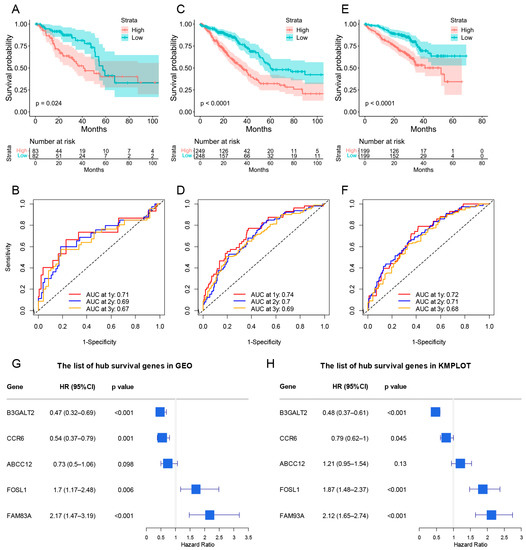 The validation of risk score model for predicting OS of LUAD. (A–F) The validations of KM plot and AUC plot were constructed from the TCGA-LUAD validation group (A,B), total TCGA-LUAD group (C,D), and GEO-LUAD group (E,F). (G,H) The forest plot containing the hub genes in GEO database and KMPLOT database (B3GALT2, CCR6, ABCC12, FOSL1, and FAM83A).