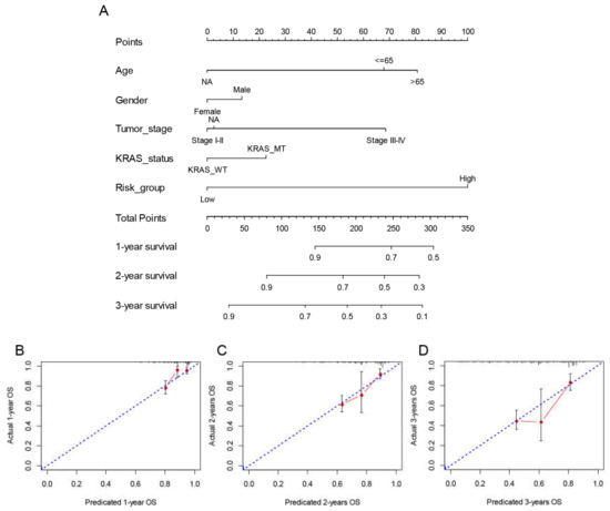 A prognostic risk score model based on hub survival genes was created. According to the KM method, a higher risk score was linked to a significantly lower OS in LUAD (Figure 9C). The AUC plot showed that this prognostic signature had relatively high ability to predict the OS of LUAD patients (AUC > 0.7 for 1-year, 2-year and 3-year prediction, Figure 9D). These conclusions were validated in the TCGA-LUAD validation group (Figure 10A,B), total TCGA-LUAD group (Figure 10C,D), and an external GEO-LUAD group (Figure 10E,F). Notably, when we conducted the predictive analysis, there were only 5 genes (B3GALT2, CCR6, ABCC12, FOSL1, and FAM83A) in the GEO database. The detailed prognostic information of those genes was listed in a forest plot (Figure 10G). We further validated the prognostic results of these five genes by Kaplan–Meier plotter (KMPLOT) website [24], which showed consistent results as in the GEO database that the higher expression of B3GALT2 and CCR6 were associated with better OS of LUAD and the higher expression of FOSL1 and FAM83A were associated with worse OS of LUAD (Figure 10H). Moreover, a nomogram was constructed to predict 1-, 2-, and 3-year OS probability among individuals with LUAD, which comprised clinical features of age, gender, tumor stage, KRAS status and prognostic risk score model (Figure 11A). The calibration plots showed this nomogram had well prediction to the OS of LUAD patients (Figure 11B).