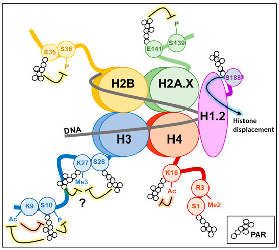 The linker histone H1, one of the first identified PARylation targets in the native chromatin, contributes to high-order chromatin compaction by binding the linker DNA between nucleosomes. Following maximal activation of PARP-1 activity during DNA damage, H1 is covalently PARylated in different amino acid residues across the entire protein structure. It can also bind PARs non-covalently via the lysine-rich C-terminal domain [52,53]. In vitro and in vivo experiments mainly indicate that PARylation promotes H1 displacement from chromatin to promote chromatin relaxation, allowing the recruitment of DNA repair factors [53,54,55]. Interestingly, the crosstalk between H1 and PARP-1 is also relevant during the signalling process associated with DDR by regulating chromatin recruitment of ataxia telangiectasia mutated (ATM) kinase. The H1.2 isoform protects chromatin from aberrant ATM loading and activation in basal conditions. Upon DNA damage, PARP-1 covalently modifies H1.2 at the S188 residue, displacing it from chromatin to promote efficient recruitment and activation of ATM kinase at DNA damage sites [56] (Figure 2).