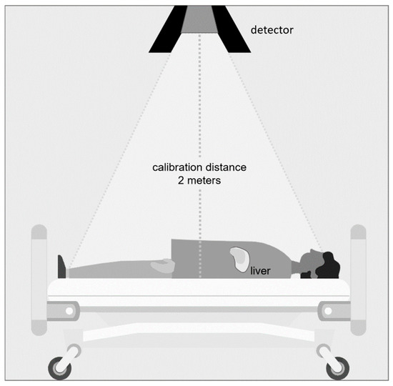 To measure the intratherapeutic effective half-life of 166Ho, the dose rate arising from a patient was recorded at three time points per day (9 a.m., 1 p.m., and 8 p.m.) using dose rate monitors placed above their beds (DLMon with Geiger-Mueller counter tube, type 70004 SON16, STEP Sensortechnik und Elektronik Pockau GmbH, Pockau-Lengefeld, Germany). The probe SON16, with a measuring range of 1–500 μSv/h and an energy range of 35 keV–1.3 MeV, is equipped with a lead collimator on all sides that has aperture angles of +/− 30° mediolateral and +/− 60° mediocaudal/mediocranial. At the time of measurement, the patients were in a reproducible supine position. An average dose rate value was calculated over a period of 30 min with a fixed and reproducible setup (Figure 1).