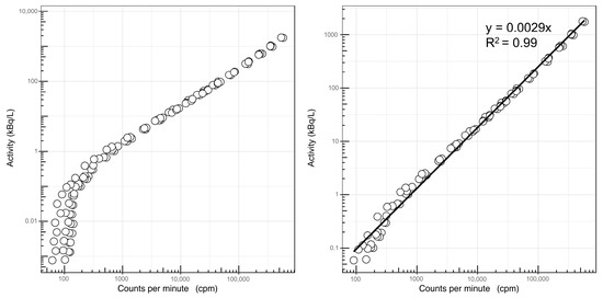 Measuring system calibration charts showing all measurements (circles), including long-living nuclides below 150 cpm (left) and without these nuclides (right).