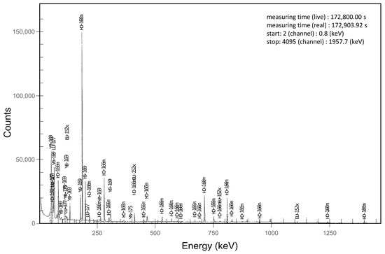 Results of the scintillation detector measurements over time showed the expected linear decay of 166Ho to 166Er down to a count rate of 150 counts per minute (cpm) (Figure 2). The calibration function calculated from these 116 readings was y = 0.0029x−15.6. After 150 cpm, no further decrease in the count rate was noted, suggesting the presence of long-living radionuclides. For further evaluation, the samples were transferred to the HPGe gamma-ray spectrometer. The resulting energy spectra confirmed several impurities, primarily the meta-stable 166mHo (Figure 3).