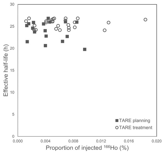 Correlation between effective half-life and excreted activity of 166Ho after TARE planning (24 h) and TARE treatment (48 h) procedures.