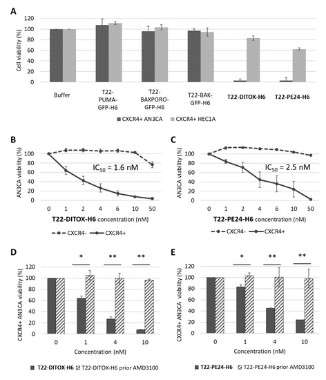 The CXCR4-dependent cytotoxic effect induced by T22-DITOX-H6 and T22-PE24-H6, at a low nanomolar range, in human endometrial cancer cells in vitro. (A) Screening of therapeutic nanoparticles targeted to the CXCR4 receptor, at 1 µM protein concentration, in the CXCR4+ AN3CA and CXCR4+ HEC1A cell lines. T22-DITOX-H6 and T22-PE24-H6 show a higher cytotoxic effect on CXCR4+ AN3CA cells than the rest of pro-apoptotic nanoparticles. (B,C) Dose–response curve expressed as percent of remaining viable CXCR4+ and CXCR4- AN3CA cells after exposure to T22-DITOX-H6 (B) or T22-PE24-H6 (C) at the 1–50 nM range. (D,E) Competition assays, measuring the percent of viable CXCR4+ AN3CA cells after exposure to T22-DITOX-H6 (D) or T22-DITOX-H6 (E) without or with a prior exposure to the CXCR4 antagonist AMD3100. * p < 0.005; ** p = 0.001 (mean ± SEM; Mann–Whitney).