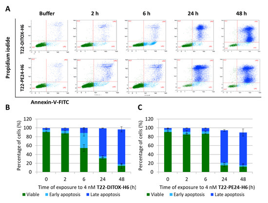 Translocation of phosphatidyl serine was assessed by annexin V/PI assay in CXCR4+ Luciferase+ AN3CA cells exposed to 4 nM T22-DITOX-H6 or T22-PE24-H6. While early apoptosis only could be assessed in T22-DITOX-H6 treated cells at 6 h, late apoptosis can be found at 24 h in cells treated with any of the two nanotoxins (Figure 2A–C).